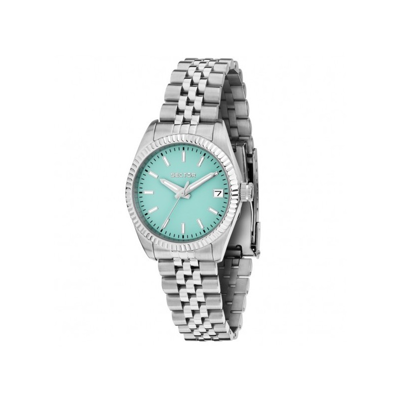 Herrenarmbanduhr von Sector aus der Kollektion 240 mit Miyota 2115 Quarzwerk und Datumsanzeige. Rundes, silberfarbenes Edelstahlgehäuse, 32 mm Durchmesser und 9,15 mm dick. Geriffelte Lünette.