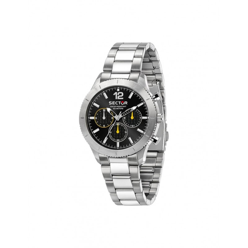 Herrenarmbanduhr von Sector aus der Kollektion 270 mit Quarzwerk und Chronographenfunktion. Rundes, silberfarbenes Edelstahlgehäuse mit 41 mm Durchmesser und 12,5 mm Dicke sowie verschraubtem Gehäuseboden. Schwarzes analoges Zifferblatt mit Strichindizes und arabischer Ziffer bei 12 Uhr, gelben Akzenten, Logo oben, Mineralglas. Silberfarbenes Edelstahlarmband mit Faltschließe und Druckknopfverschluss. Wasserdicht bis 5 ATM: spritzwassergeschützt, aber nicht druckfest.