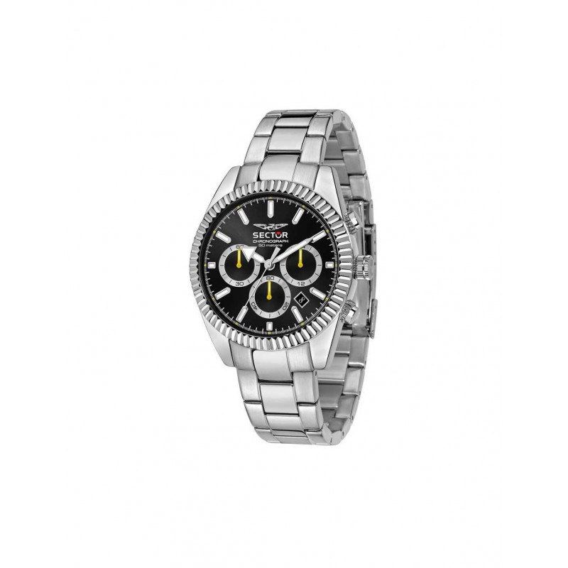 Sector Limited Edition Herrenarmbanduhr aus der Kollektion 240 mit Multifunktions-Quarzwerk. Rundes, silberfarbenes Edelstahlgehäuse (41 mm Durchmesser, 10,7 mm dick), verschraubter Gehäuseboden und gerändelte, silberfarbene Edelstahllünette. Schwarzes analoges Zifferblatt mit Strichindizes, Datumsanzeige zwischen 4 und 5 Uhr, Logo oben, Mineralglas. Silberfarbenes Edelstahlarmband mit Faltschließe und Sicherheitsverschluss. Wasserdicht bis 5 ATM: spritzwassergeschützt, aber nicht druckfest.