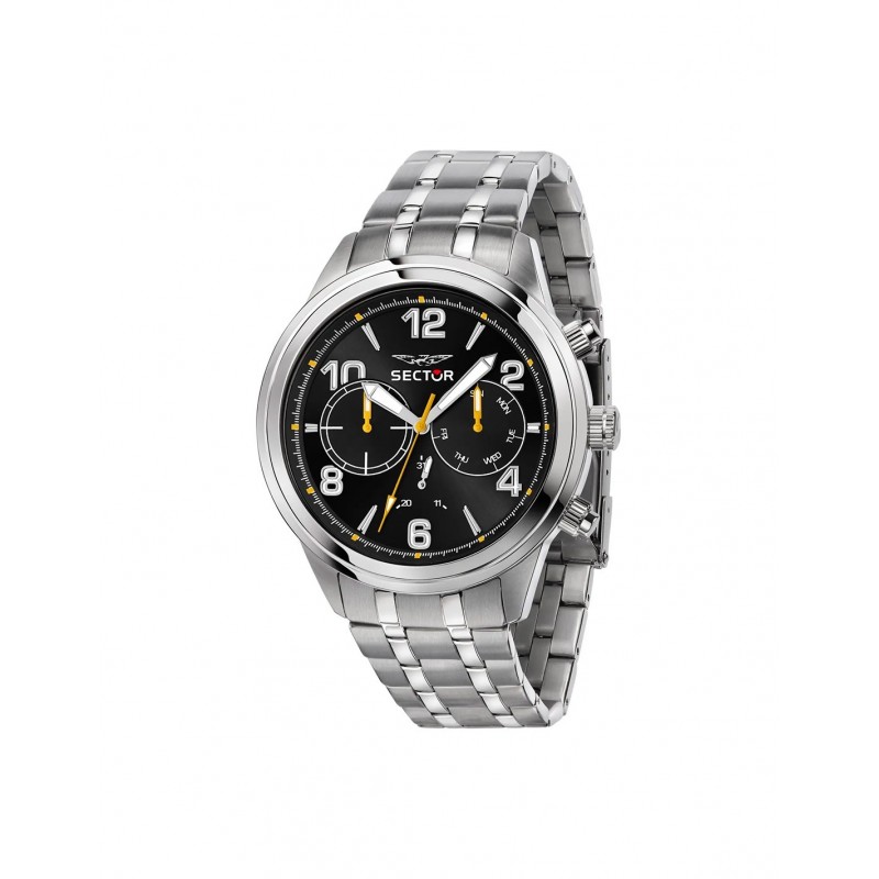 Sector Limited Edition Herrenarmbanduhr aus der Kollektion 670 mit Multifunktions-Quarzwerk. Rundes Edelstahlgehäuse (45 mm Durchmesser, 10,2 mm dick) mit Schnappdeckel. Schwarzes analoges Zifferblatt mit gemischten Indizes (Strich- und arabische Ziffern), Logo oben, Hilfszifferblätter mit Datumsanzeige, Mineralglas. Silberfarbenes Edelstahlarmband mit polierter und satinierter Oberfläche, Faltschließe und Sicherheitsverschluss. Wasserdicht bis 5 ATM: spritzwassergeschützt, aber nicht druckfest.