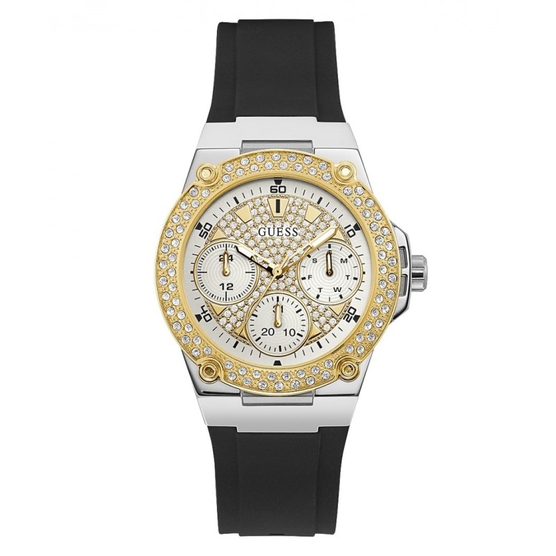Guess Damenarmbanduhr aus der Sparkling-Kollektion mit Quarzwerk. Quadratisches Gehäuse aus silberfarbenem Stahl mit einem Durchmesser von 39 mm und einer Dicke von 11 mm, runde goldfarbene Lünette mit weißen Zirkonen, analoges Zifferblatt mit Zirkonen und goldfarbenen Details, Datumsfunktion, Mineralglas. Schwarzes Silikonarmband mit Dornschließe. 5 ATM wasserdicht