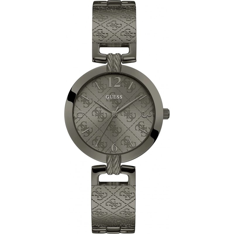 Guess Damenarmbanduhr mit Quarzwerk und Zeitfunktion. Edelstahlgehäuse mit grauer IP-Behandlung mit einem Durchmesser von 35 mm, graues analoges Zifferblatt mit Logomotiv und gemischten Strichindizes und arabischen Ziffern, Mineralglas. Armband aus poliertem Edelstahl mit grauer IP-Behandlung, Logomotiv und verstellbarem Verschluss. 3 ATM wasserdicht