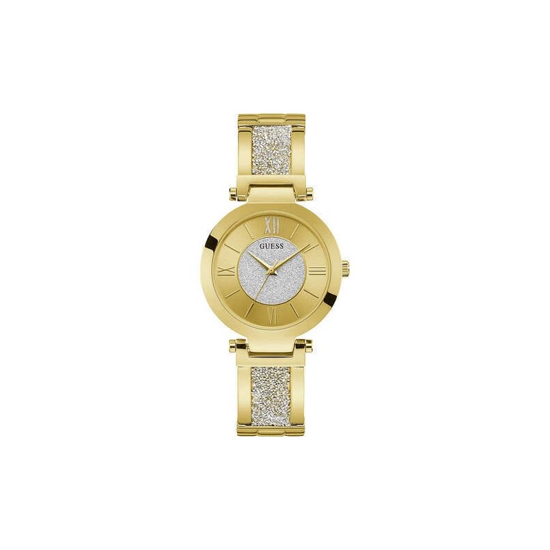 Guess Damenarmbanduhr aus der Aurora-Kollektion mit Quarzwerk und Zeitfunktion. Rundes Gehäuse aus poliertem Edelstahl mit goldener IP-Behandlung mit einem Durchmesser von 36 mm, goldfarbenes Analogzifferblatt mit zentralem Glitzer mit gemischten Strichindizes und römischen Ziffern, Mineralglas. Edelstahlarmband mit Gold- und Glitzer-IP-Behandlung mit verstellbarer Faltschließe. 3 ATM wasserdicht: beständig gegen Spritzwasser, aber nicht unter Druck