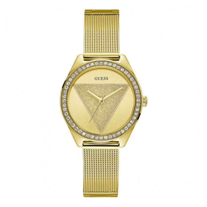 Guess Damenarmbanduhr aus der Tri Glitz-Kollektion mit Quarzwerk und Nur-Zeit-Funktion. Rundes Edelstahlgehäuse mit Gold-IP-Behandlung mit einem Durchmesser von 36,5 mm und einer Dicke von 10 mm, Stahllünette mit einem Umriss aus weißen Kristallen verziert, Presssitz-Stahlrückseite, analoges goldfarbenes Zifferblatt mit glitzerndem Dreieckslogo ohne Indexe , Logo auf der Oberseite, Mineralglas. Edelstahlarmband mit Gold-IP-Behandlung, zur Hälfte aus Milan-Mesh und verstellbarer Faltschließe mit Knöpfen, wasserdicht bis 10 ATM.