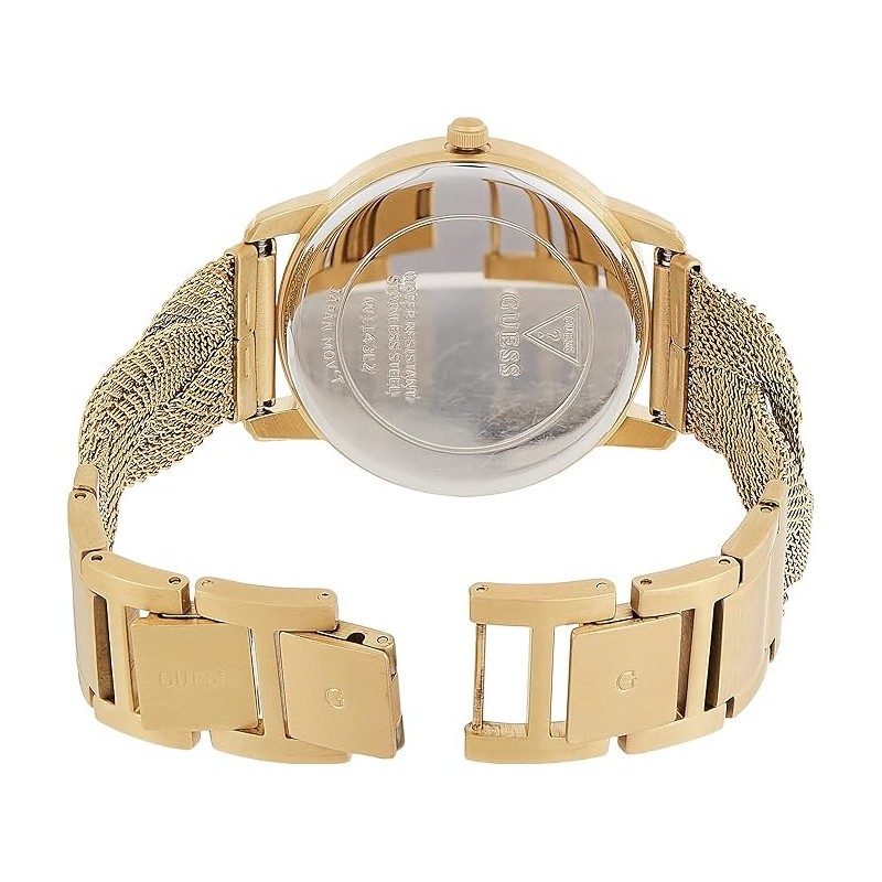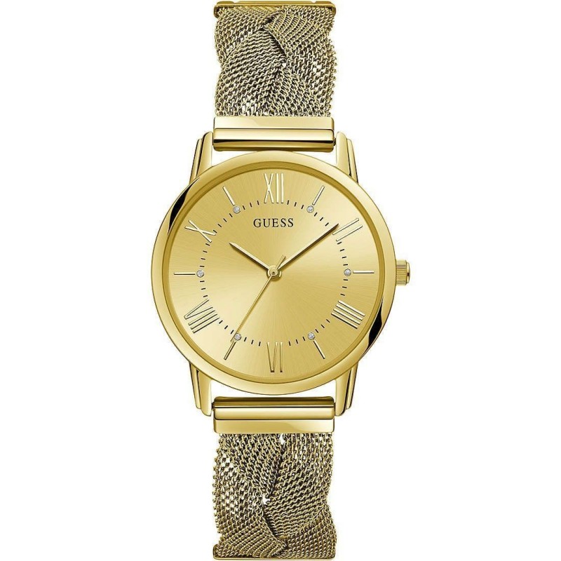 Guess Damenarmbanduhr aus der Chiffon-Kollektion mit Dreizeiger-Quarzwerk und Nur-Zeit-Funktion. Rundes Edelstahlgehäuse mit Gold-IP-Behandlung und poliertem Finish, 36 mm Durchmesser und 9 mm Dicke, Presssitz-Stahlrückseite, goldfarbenes analoges Zifferblatt mit römischen Ziffernindizes, Logo auf der Oberseite, Mineralglas. Halbarmband aus goldfarbenem Stahlgeflecht und verdeckter Schließe, wasserdicht bis 10 ATM