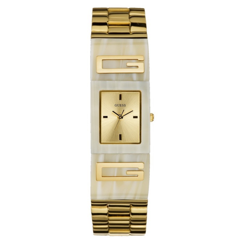 Guess Damenarmbanduhr mit Drei-Zeiger-Quarzwerk und Nur-Zeit-Funktion. Rechteckiges Edelstahlgehäuse mit einem Durchmesser von 32 mm, Lünette aus knochenähnlichem Kunstharz, Boden und Krone mit Presspassung, analoges goldfarbenes Zifferblatt mit 4 Stabindexen mit Logo bei 12 Uhr, Mineralglas. Goldfarbenes Edelstahlarmband, teilweise mit knochenähnlichem Harz beschichtet, mit Faltschließe, 3 ATM wasserdicht: beständig gegen Spritzwasser, aber nicht unter Druck.