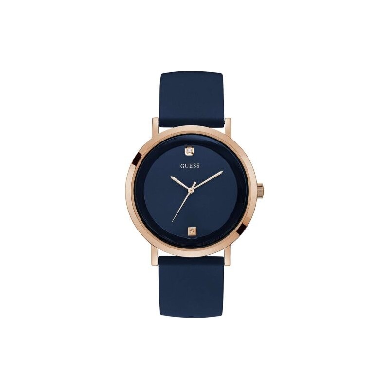 Guess Herrenarmbanduhr aus der Supernova Kollektion mit Quarzwerk und reiner Zeitanzeige. Rundes, roségoldfarbenes Edelstahlgehäuse mit polierter Oberfläche, 44 mm Durchmesser und 9 mm Dicke, Schnappdeckel aus Edelstahl. Blaues analoges Zifferblatt mit zwei Steinindizes bei 12 und 6 Uhr, Logo oben, Mineralglas. Blaues Silikonarmband mit Dornschließe, wasserdicht bis 3 ATM: spritzwassergeschützt, aber nicht druckfest.