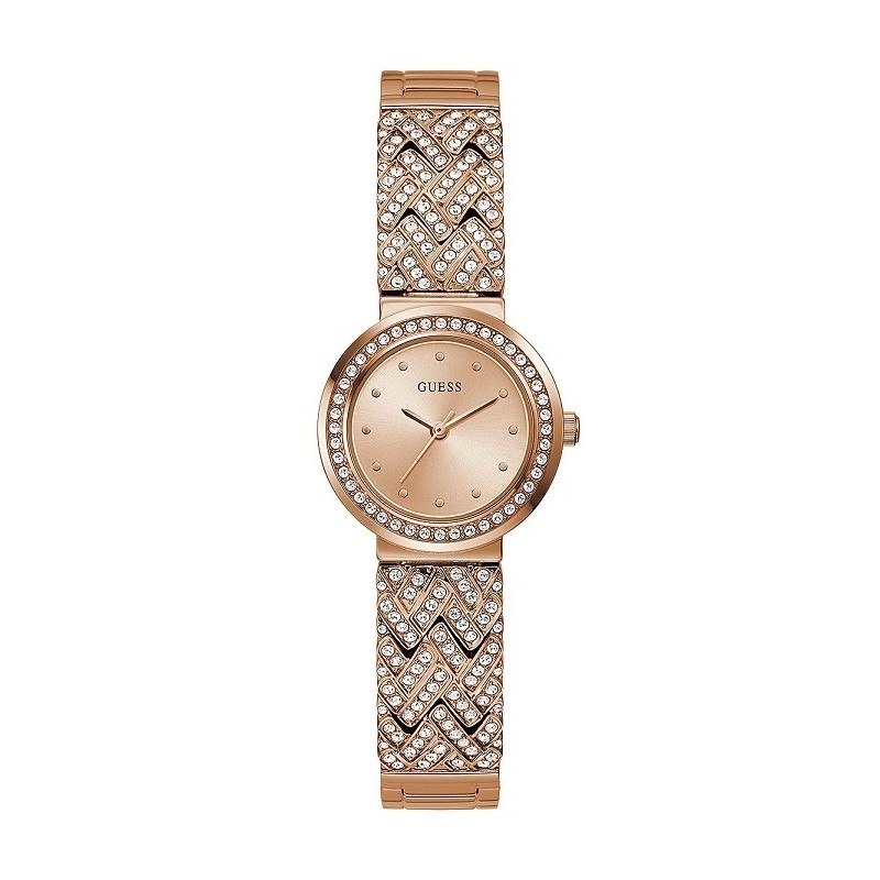 Guess Damenarmbanduhr aus der Treasure Kollektion mit Quarzwerk und reiner Zeitanzeige. Rundes Gehäuse aus roségoldfarbenem Edelstahl, 28 mm Durchmesser, roségoldfarbene Edelstahllünette mit weißen Kristallen. Roségoldfarbenes analoges Zifferblatt mit applizierten Steinindizes, Logo oben, Mineralglas. Halbstarres Armband aus roségoldfarbenem Edelstahl mit weißen Kristallen und verdeckter Faltschließe. Wasserdicht bis 3 ATM: Spritzwassergeschützt, jedoch nicht druckfest.