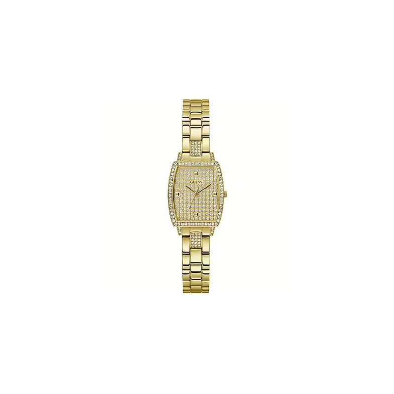 Guess Damenarmbanduhr aus der Brilliant Kollektion mit Quarzwerk und reiner Zeitanzeige. Quadratisches, goldfarbenes Edelstahlgehäuse mit 28 mm Durchmesser und 8,2 mm Dicke, goldfarbene Edelstahllünette mit weißen Kristallen, Schnappdeckel und herausziehbarer Krone. Analoges Zifferblatt mit Strasssteinen und vier goldfarbenen Indizes, Logo oben, Mineralglas. Poliertes, goldfarbenes Edelstahlarmband mit weißen Kristallen und Druckknopf-Faltschließe. Nicht wasserdicht.