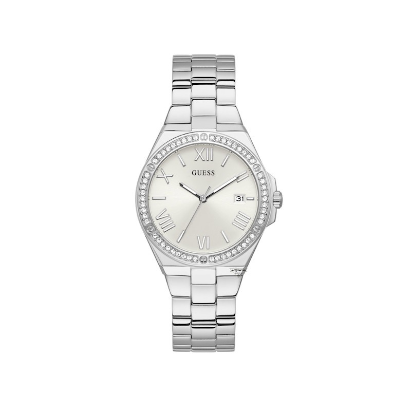 Guess Damenarmbanduhr aus der Harper Kollektion mit Quarzwerk und Datumsanzeige. Rundes, silberfarbenes Edelstahlgehäuse (38 mm Durchmesser), silberfarbene Edelstahllünette mit weißen Kristallen. Silbernes Zifferblatt mit römischen Ziffern, Datumsanzeige bei 3 Uhr, Logo oben, Mineralglas. Silberfarbenes Edelstahlarmband mit Faltschließe und Druckknopfverschluss. Wasserdicht bis 3 ATM: spritzwassergeschützt, aber nicht druckfest.
