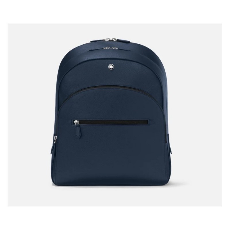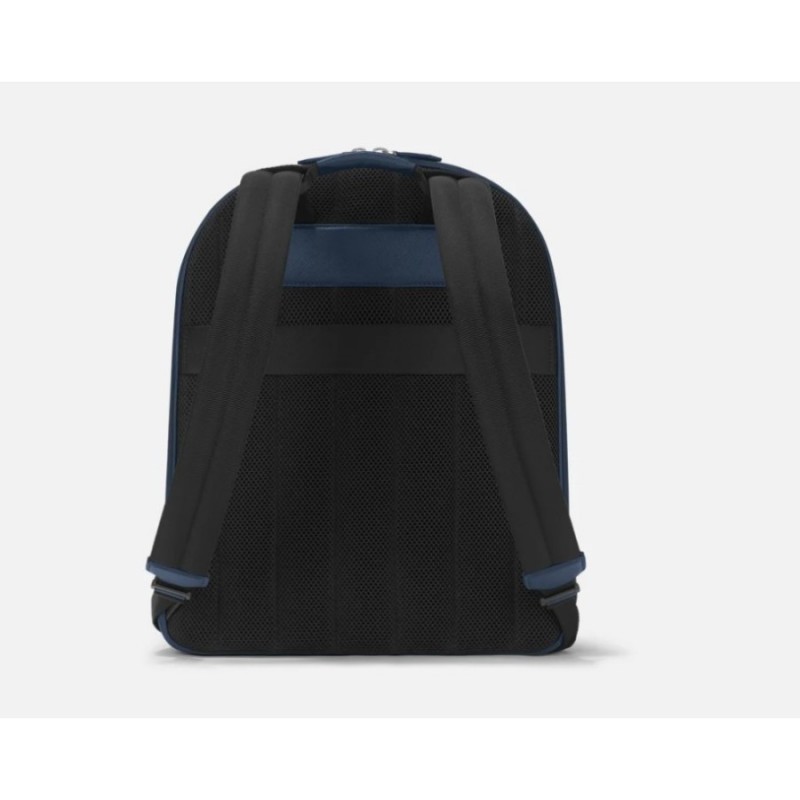 The Mont Blanc unisex large backpack from the Sartorial collection is crafted from full-grain Saffiano-print cowhide in ink blue, with a polyamide and cotton lining and two adjustable straps. It features a front zippered pocket for easy access to smaller items and three main compartments that perfectly accommodate essentials and more. There's also a padded laptop compartment for up to a 15-inch laptop, as well as a zippered pocket, two open pockets, and two dedicated pockets for your favorite writing instruments. The satellite system allows for easy attachment to a trolley. Its dimensions are 340 x 150 x 420 mm.