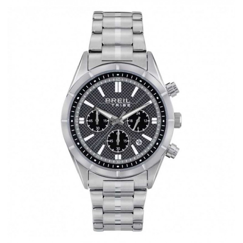 Chronograph watch from the Breil Lead men's collection. Case color: silver; dial color: black; bracelet color: silver. Case 42 mm diameter in 316L stainless steel, dial with circular shape pattern baton indexes and date. Mineral glass. 316L bilux stainless steel bracelet with folding clasp and safety clasp. Quartz movement. Movement PE 902. Water resistance classification (WR) 10 atm: suitable for swimming, yachting, snorkeling, boating.