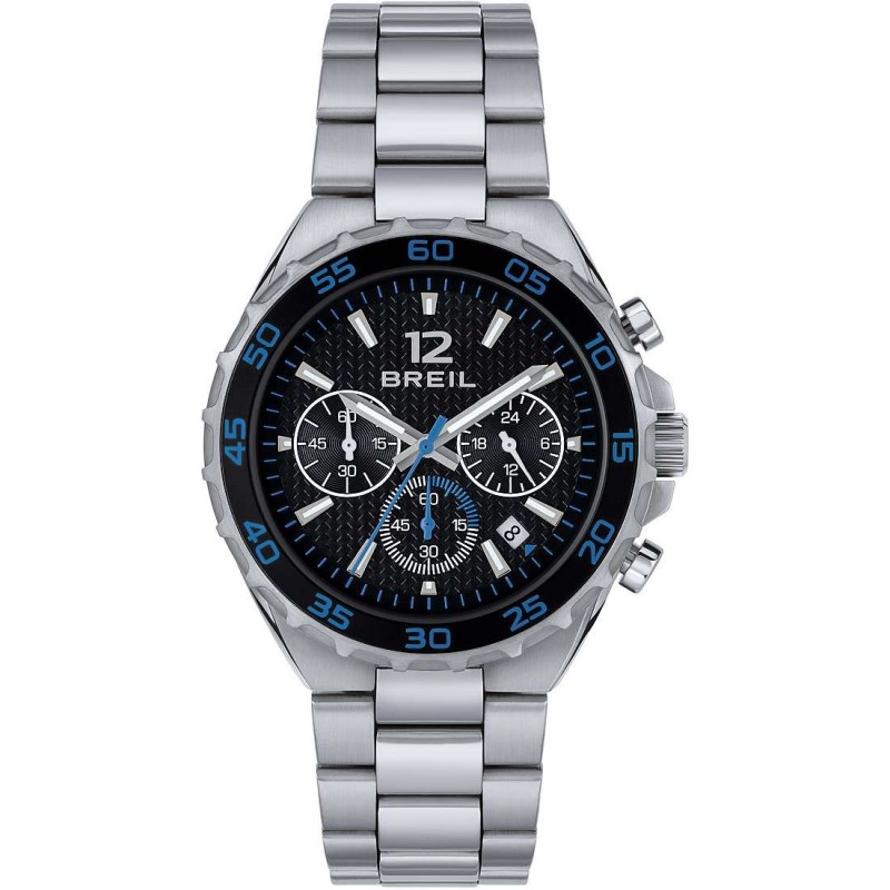 Breil men's chronograph watch from the Highway collection. Chronograph watch with 42 mm case made of steel with bilux finish. Black dial with blue pattern and details, black aluminum bezel with blue details, silver spheres and indexes with luminous. Blue seconds hand, counters with cd pattern and white and blue details. Brushed steel bracelet with polished central section. Button closure and safety clasp. Function: date. The glass is mineral. The case back is screwed. The movement is quartz tmi vd53. The water resistance is: 5 ATM