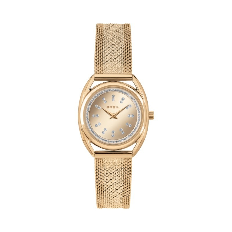 Breil women's wristwatch from the Petit Charme collection with 5y20 quartz movement and time-only function. Round, gold-plated steel case measuring 28 mm in diameter. Gold-tone analog dial embellished with white crystals and stone indexes, logo at the top, mineral glass. Gold-plated stainless steel Milanese mesh strap with sliding clasp and safety catch, water resistant to 10 ATM.