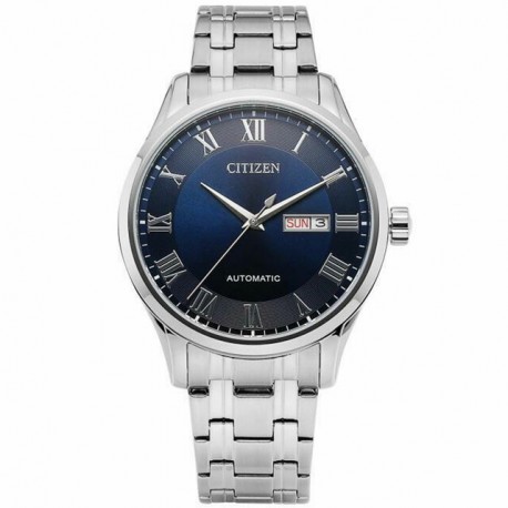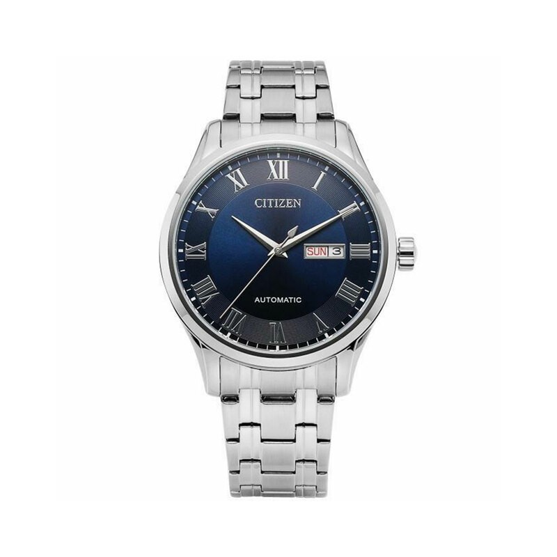 Citizen men's wristwatch with automatic movement, 41 mm silver-colored steel case, solid bottom and pull crown, blue analogue dial with Roman numeral indices and date function, mineral glass, silver-colored steel strap with folding clasp, resistant to water 5 ATM
