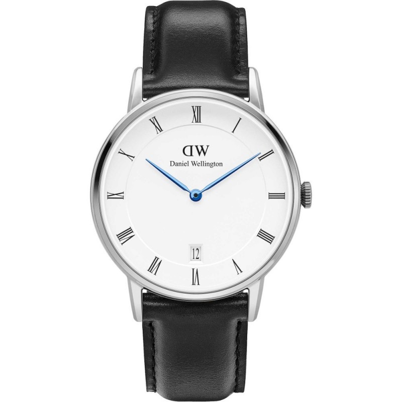 Daniel Wellington women's watch from the Dapper Sheffield collection, only time watch with quartz movement, 34mm silver-colored stainless steel case, white round-shaped analogue dial with black Roman numeral hour markers and blue hands, mineral glass, date function, Light black leather strap with pin buckle closure, 3 ATM water resistant