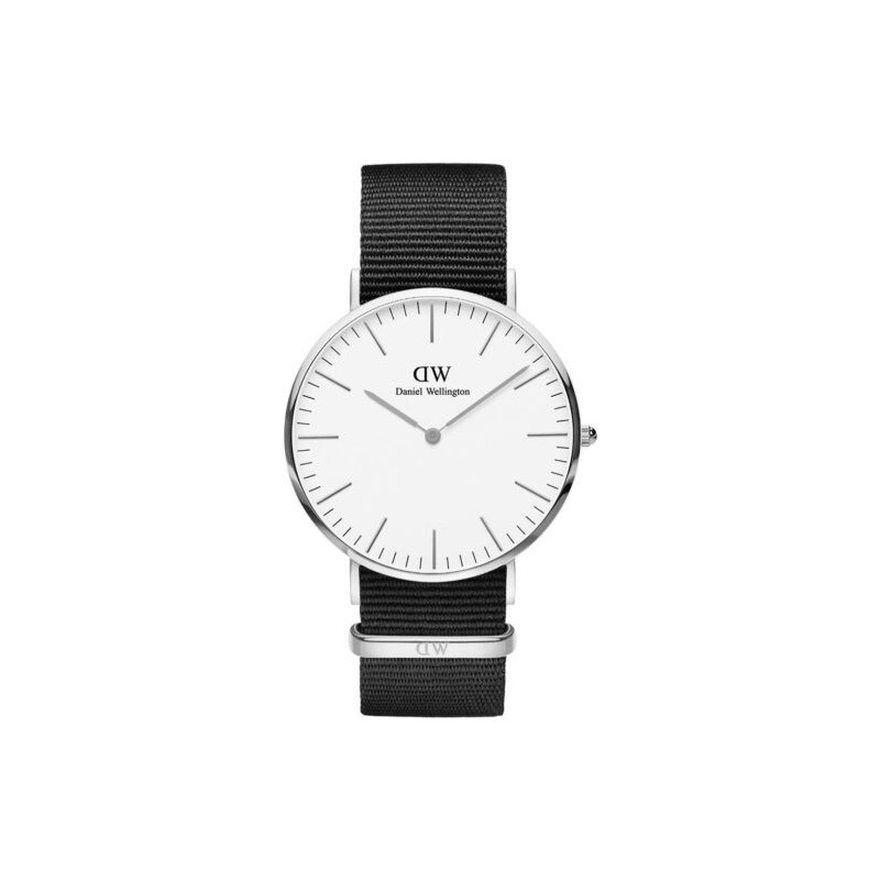 Daniel Wellington's time-only men's wristwatch from the Classic collection with Miyota quartz movement. Round-shaped silver-colored stainless steel case with polished finish with a diameter of 40mm and a thickness of 6mm, white analog dial with silver-colored stick indexes, mineral glass. Black fabric strap with adjustable clasp and pin buckle, 3 ATM water resistant: resistant to splashes of water but not under pressure.