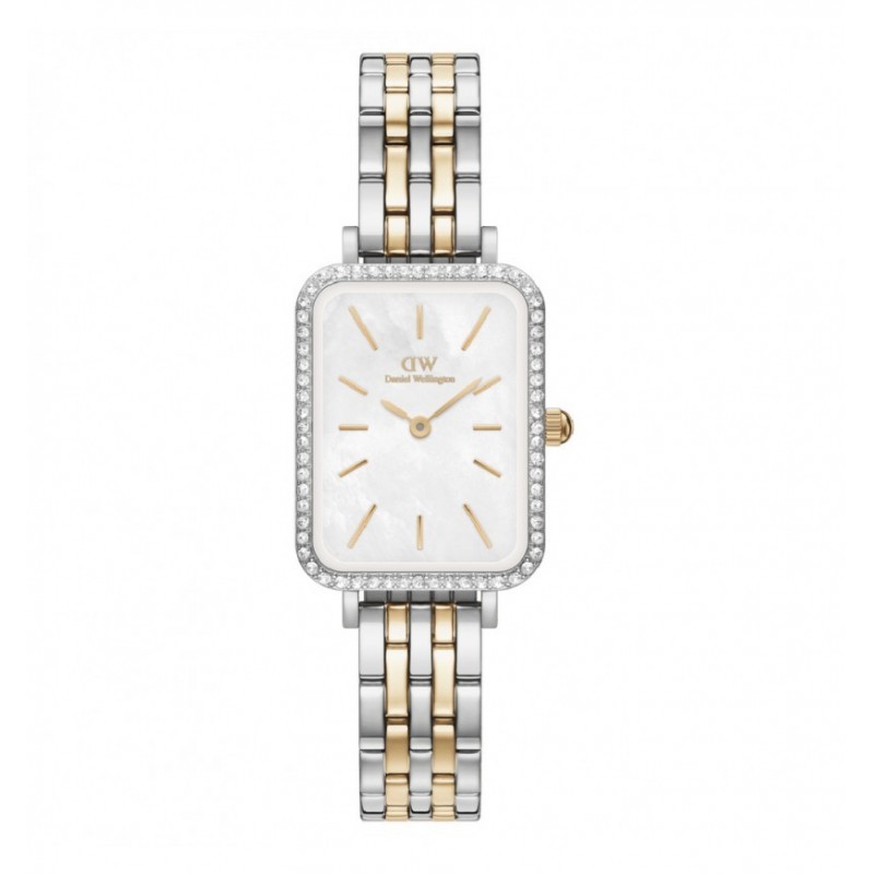 Daniel Wellington women's wristwatch from the Quadro collection with quartz movement and time-only functions. Rectangular stainless steel case measuring 20 x 26 mm in diameter and 6 mm thick, embellished with white crystals. White mother-of-pearl analog dial with gold-tone stick indexes, logo at the top, mineral crystal. Two-tone silver and gold stainless steel strap with push-button deployment clasp. Water resistant to 3 ATM: splashes of water but not pressurized.