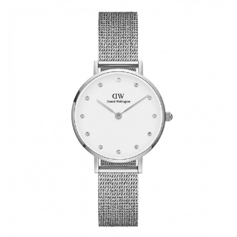 Daniel Wellington women's wristwatch from the Lumine collection with GL22 quartz movement and time-only functions. Round, silver-tone stainless steel case, 28 mm in diameter and 6 mm thick, with a snap-on steel case back. White analog dial with gemstone indexes, logo at the top, mineral crystal. Silver-tone stainless steel Milanese mesh strap with adjustable sliding clasp and safety lock. Water resistant to 3 ATM: splashes of water, but not pressurized.