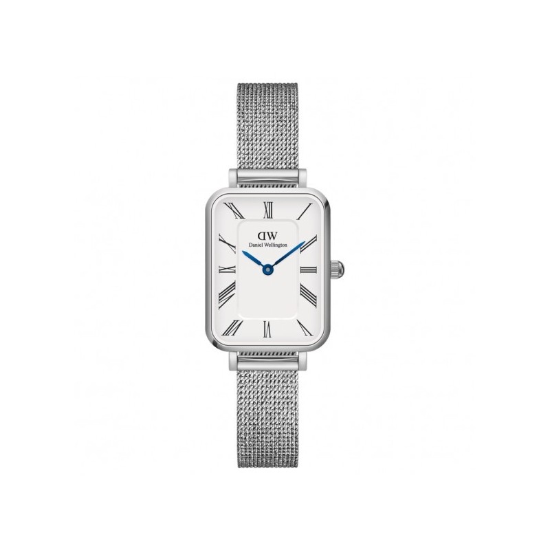 Daniel Wellington women's wristwatch from the Quadro collection with quartz movement and time-only functions. Rectangular silver-tone stainless steel case, 26 mm in diameter and 6 mm thick. White analog dial with Roman numeral indexes and blue hands, logo at the top, mineral crystal. Silver-tone stainless steel Milanese mesh strap with adjustable sliding clasp and safety catch. Water resistant to 3 ATM: splashes of water, but not pressurized.