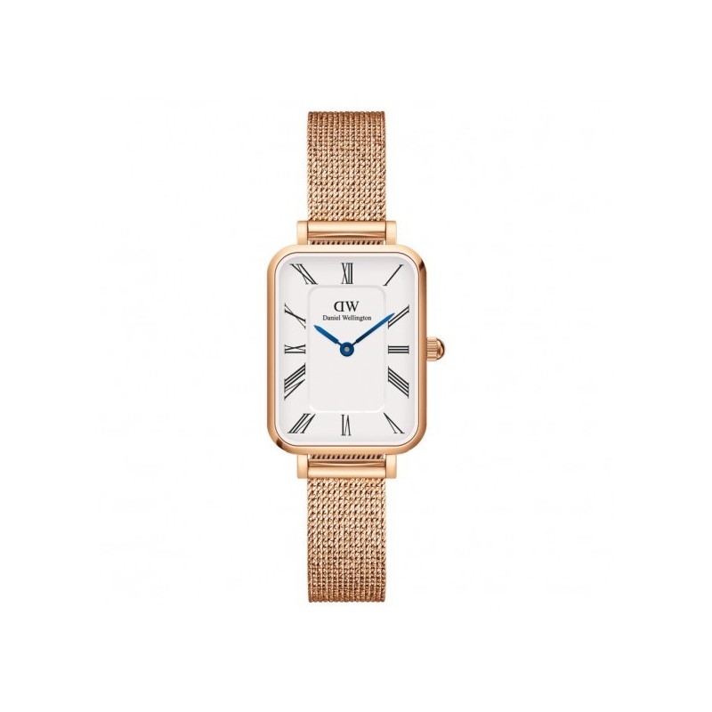 Daniel Wellington women's wristwatch from the Quadro collection with quartz movement and time-only functions. Rectangular rose gold PVD stainless steel case, 26 mm in diameter and 6 mm thick. White analog dial with Roman numeral indexes and blue hands, logo at the top, mineral crystal. Rose gold PVD stainless steel mesh strap with adjustable sliding clasp and safety catch, water resistant to 3 ATM: splashes of water, but not pressurized.