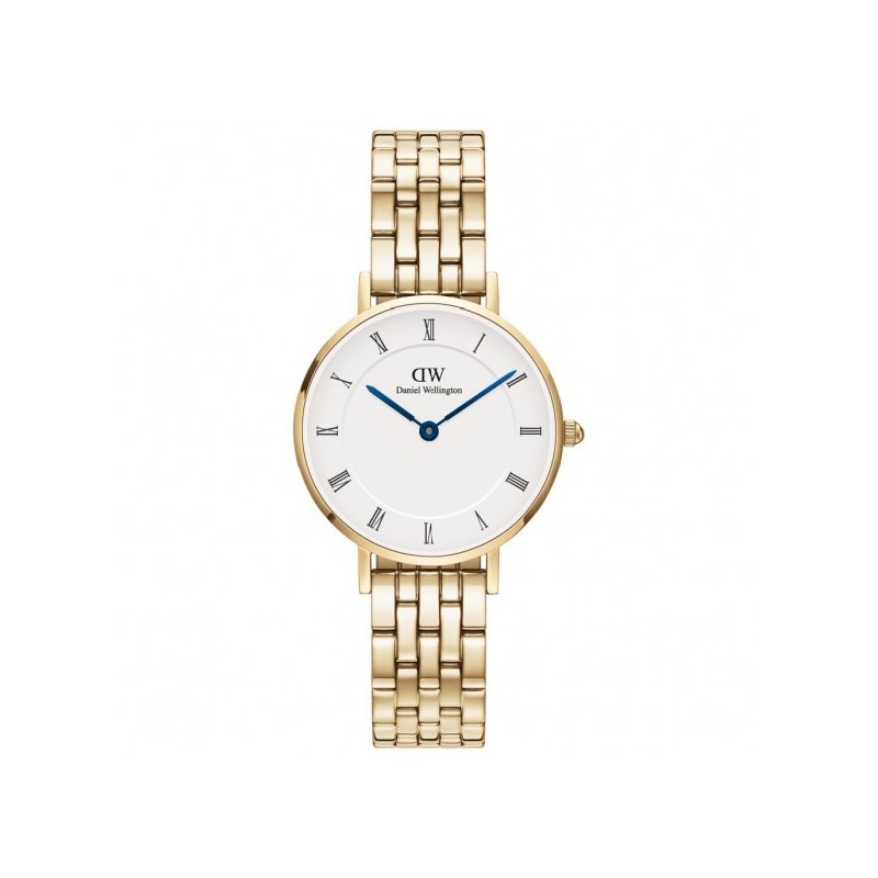 Daniel Wellington women's wristwatch from the Petite collection with quartz movement and time-only functions. Round, gold-plated PVD stainless steel case measuring 28 mm in diameter and 6 mm thick. White analog dial with Roman numeral indexes and blue hands, logo at the top, mineral crystal. Gold-plated PVD stainless steel strap with a fold-over clasp, water resistance 3 ATM: splash-proof, but not pressurized.