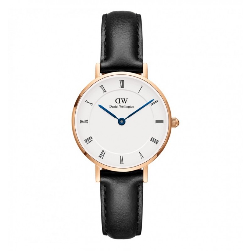 Daniel Wellington women's wristwatch from the Petite collection with quartz movement and time-only functions. Round rose gold-tone stainless steel case, 28 mm in diameter and 6 mm thick, with a snap-on steel caseback. White analog dial with Roman numeral indexes and blue hands, logo at the top, mineral crystal. Black leather strap with pin buckle closure, water resistance 3 ATM: splash-proof but not pressurized.