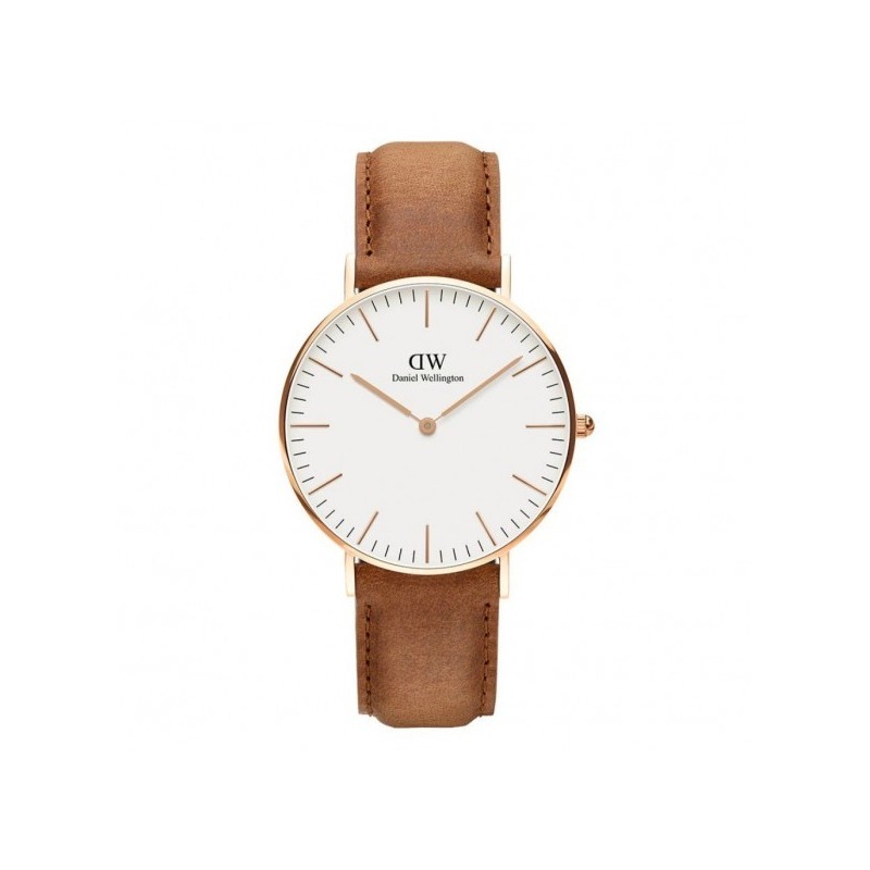 Daniel Wellington unisex wristwatch from the Classic collection with quartz movement and time-only function. Round rose gold-tone stainless steel case, 36 mm in diameter and 6 mm thick, with a snap-fit steel case back. White analog dial with stick indexes and rose gold-tone hands, logo at the top, mineral crystal. Light brown leather strap with pin buckle closure, water resistance 3 ATM: splash-proof but not pressurized.