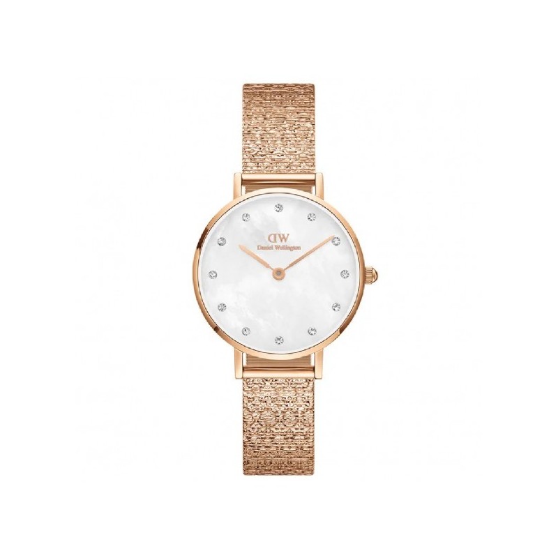 Daniel Wellington women's wristwatch from the Lumine collection with GL22 quartz movement and time-only functions. Round rose gold-tone stainless steel case, 28 mm in diameter and 6 mm thick, with a snap-on steel case back. White mother-of-pearl analog dial with white Preciosa crystals at the indexes, logo at the top, mineral glass. Rose gold-tone stainless steel Milanese mesh strap with adjustable clip clasp and safety catch, water resistant to 3 ATM: splashes of water, but not pressurized.