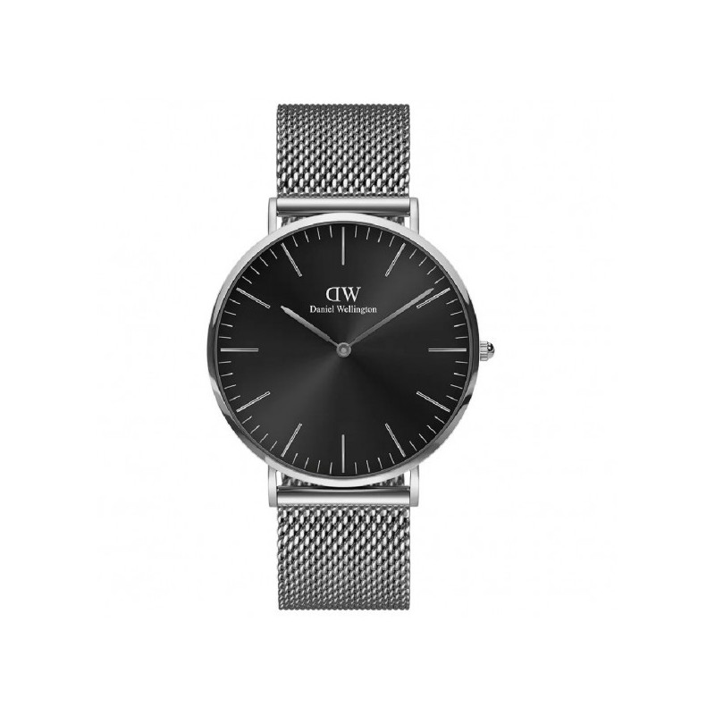 Daniel Wellington men's wristwatch from the Classic collection with quartz movement and time-only functions. Round, silver-tone stainless steel case, 40 mm in diameter and 6 mm thick, with a snap-on steel caseback. Black analog dial with silver-tone stick indexes, logo at the top, mineral crystal. Silver-tone stainless steel Milanese mesh strap with an adjustable clip clasp and safety catch, water resistant to 3 ATM: splashes of water, but not pressurized.