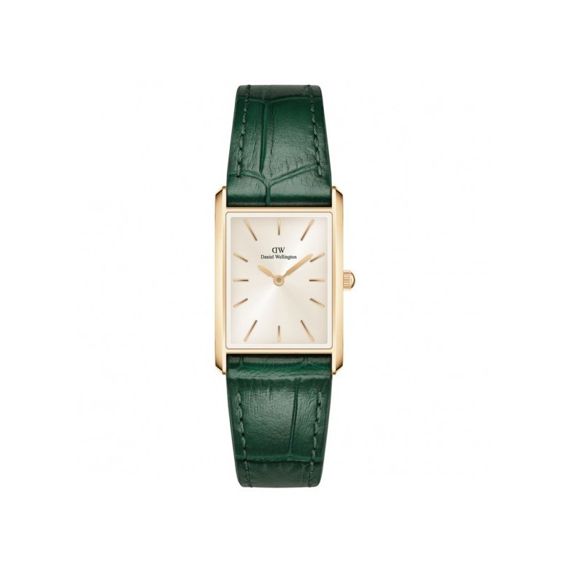 Daniel Wellington unisex wristwatch from the Quadro collection, The Bound model, with quartz movement and time-only functions. Rectangular gold-tone stainless steel case, 32 mm x 22 mm, snap-on steel case back. Champagne analog dial with gold-tone stick indexes, logo at the top, mineral crystal. Green leather strap with pin buckle closure, water resistance 3 ATM: splash-proof but not pressurized.