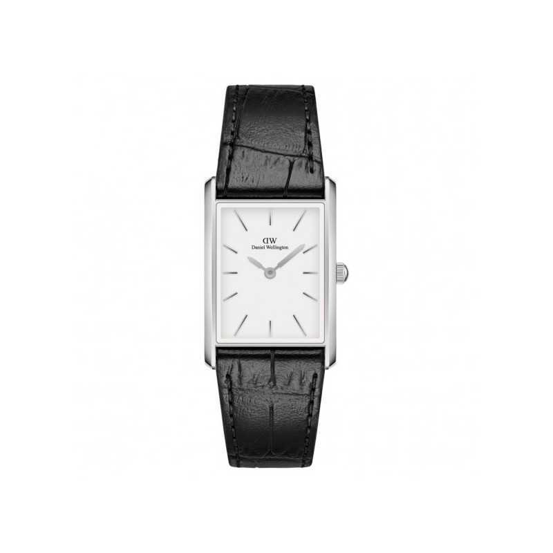 Daniel Wellington unisex wristwatch from the Quadro collection, The Bound model, with quartz movement and time-only functions. Rectangular silver-tone stainless steel case measuring 32 mm x 22 mm, snap-on steel case back. White analog dial with silver-tone stick indexes, logo at the top, mineral crystal. Black leather strap with pin buckle closure, water resistance 3 ATM: resistant to splashes of water but not pressurized.