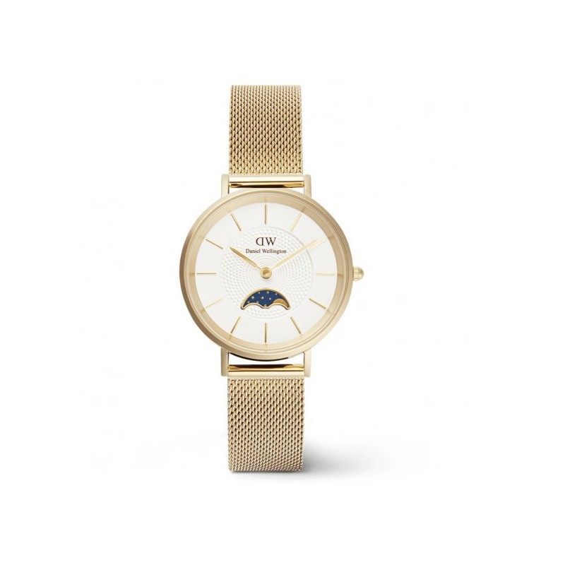 Daniel Wellington women's wristwatch from the Petite collection with quartz movement and time-only functions. Round, gold-tone stainless steel case, 32 mm in diameter and 6 mm thick, with a snap-on steel case back. Analog dial with stick indexes and moon phases at the bottom, logo at the top, mineral crystal. Gold-tone stainless steel Milanese mesh strap with adjustable clip clasp and safety catch, water resistant to 3 ATM: splashes of water, but not pressurized.