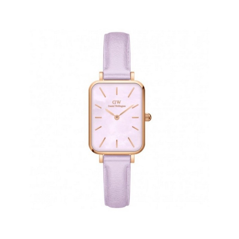 Daniel Wellington women's wristwatch from the Quadro Mop collection with quartz movement and time-only function. Rectangular rose gold-tone stainless steel case measuring 20 mm x 26 mm and 6 mm thick, with a snap-on steel caseback. Pink mother-of-pearl analog dial with rose gold-tone stick indexes, logo at the top, mineral crystal. Purple leather strap with pin buckle closure, water resistance 3 ATM: splash-proof but not pressurized.