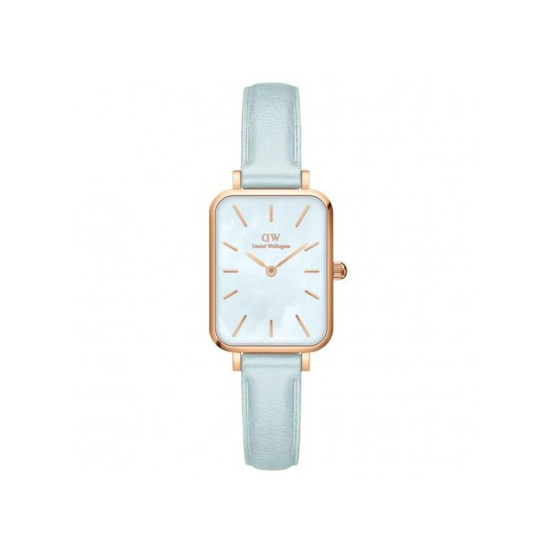 Daniel Wellington women's wristwatch from the Quadro Bluebell special edition collection with quartz movement and time-only function. Rectangular rose gold-tone stainless steel case measuring 20 mm x 26 mm and 6 mm thick, with a snap-fit steel case back. Sky blue mother-of-pearl analog dial with rose gold-tone stick indexes, logo at the top, mineral crystal. Light blue leather strap with pin buckle, water resistance 3 ATM: splash-proof but not pressurized.