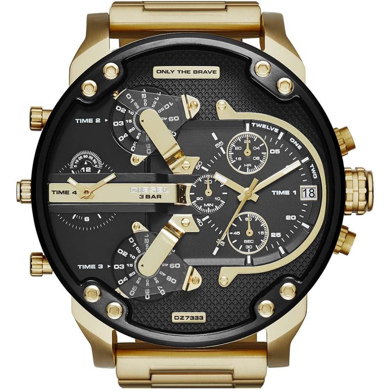 Diesel Watch Men's Watch From the Mr. Daddy 2.0 Collection. This Multifunction Watch Has A Quartz Type Movement. With Black Steel Case Of Diameter Of 57 X 66 Mm The Dial Is Round With Baton Markers And Gold Color Steel Strap The Water Resistance Is 3 Atm