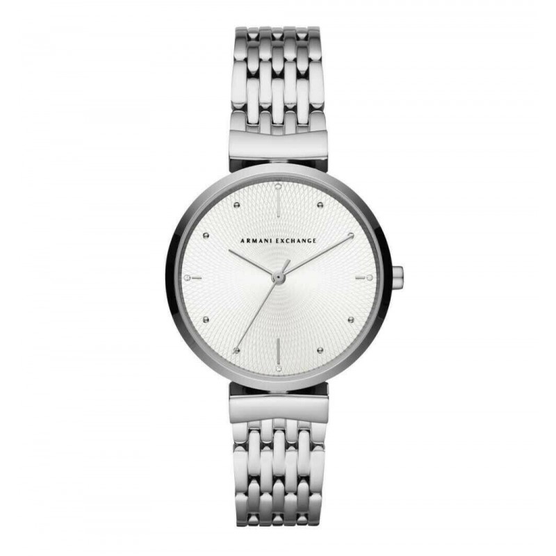 ShippingArmani Exchange Women's Only Time Watch. Model With Round Case In Stainless Steel Of Silver Color With Glossy Finish. Case Of Diameter Of 36 Mm And Of Thickness Of 8 Mm. The Dial Is Silver Color With Transparent Glass And Crystals On The Dial.