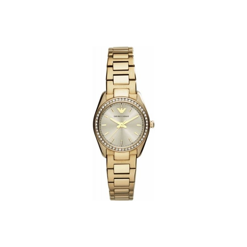 Luxury Emporio Armani AR6031 women's analogue wristwatch with quartz movement, 26 mm diameter stainless steel case, gold dial, mineral glass and black stainless steel strap.