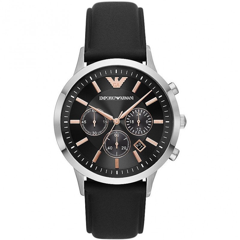 Emporio Armani Men's Chronograph Watch. Clock With 43 Mm Case Made Of Stainless Steel With Silver Satin Finish. Clock With Round Shape Case. The thickness of the case is 11 mm. The glass is transparent with a black dial. The distance between the handles is 22 mm. Clock With Stones On The Bezel On The Dial On The Bracelet. The strap is made of black leather with sandblasted finish and pin buckle. The Resistance to Water is 5 Atm. Movement: Quartz / Chrono.