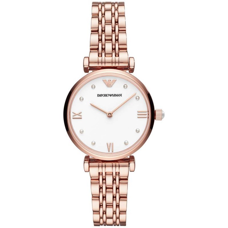 Emporio Armani women's wristwatch from the Gianni T-Bar collection with quartz movement and time only function. stainless steel case with rose gold IP treatment with a diameter of 32 mm and a thickness of 8 mm, white analog dial with mixed indexes applied to spheres and Roman numerals, logo on the upper part, mineral glass. Rose gold IP stainless steel bracelet with folding clasp, 3 ATM water resistant: resistant to splashes of water but not under pressure.