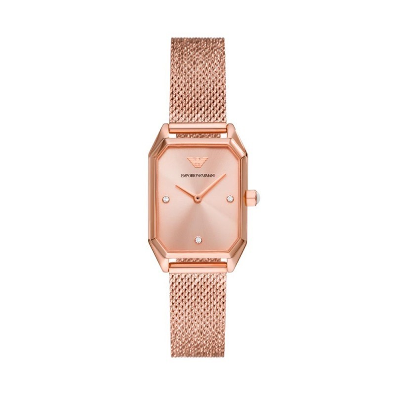 Emporio Armani women's watch with quartz movement and time only function. Rectangular-shaped stainless steel case with rose gold IP treatment with a diameter of 24 mm and a thickness of 8 mm, white analog dial with only three stone indexes, logo on the upper part, mineral glass. Stainless steel bracelet with rose gold IP treatment in milano mesh with sliding snap closure, water resistant 3 ATM: resistant to water splashes but not under pressure.