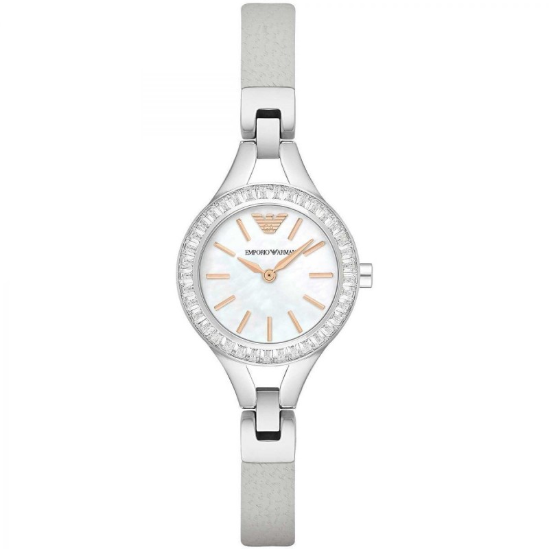 Emporio Armani women's wristwatch with quartz movement and time only function. 28 mm diameter silver-tone stainless steel case, steel bezel embellished with white baguette crystals, analog mother-of-pearl dial with rose gold-tone stick indexes, logo on the top, mineral glass. White calf leather strap with pin buckle closure, 3 ATM water resistant: resistant to splashes of water but not under pressure.