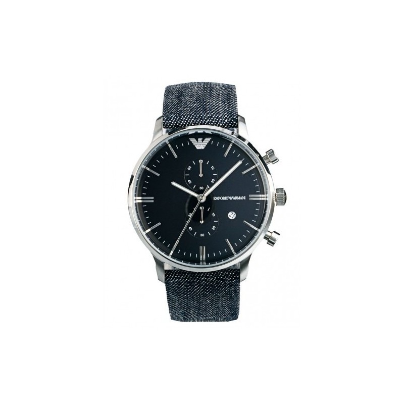 ShippingCasual Emporio Armani men's chronograph wristwatch with quartz movement, 43 mm diameter stainless steel case, black dial, mineral glass and blue fabric and calfskin strap.