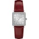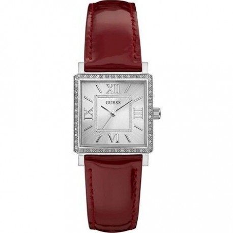 Guess women's wristwatch from the Highline collection with quartz movement and time only function. Rectangular-shaped silver steel case measuring 28 mm. bezel embellished with crystals, silver analogue dial with mixed stick indexes and Roman numerals, mineral glass. Red shiny leather strap with pin buckle closure. 3 ATM water resistant: resistant to splashes of water but not under pressure