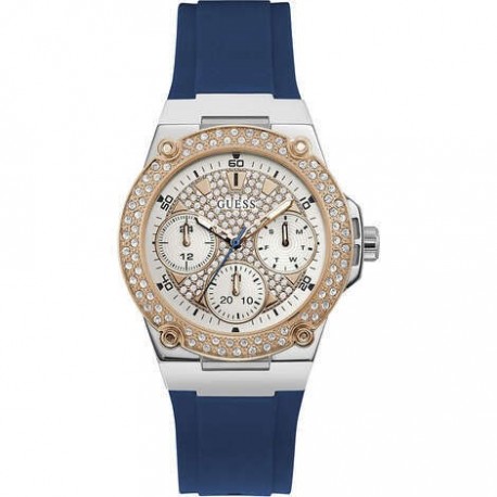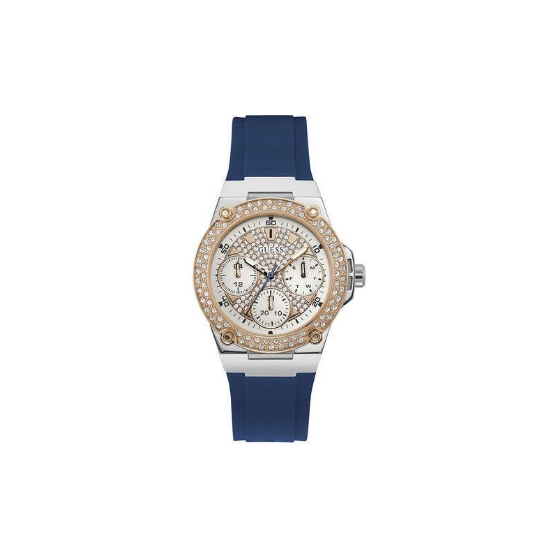 Guess casual wristwatch from the Zena W1291L2 analog women's collection with quartz movement. 39 mm diameter silver-colored stainless steel square case, rose gold-colored round bezel embellished with white zircons, silver analog dial with white zircons and rose gold details, date function, mineral glass. Blue silicone strap with pin buckle closure. 5 ATM water resistant