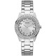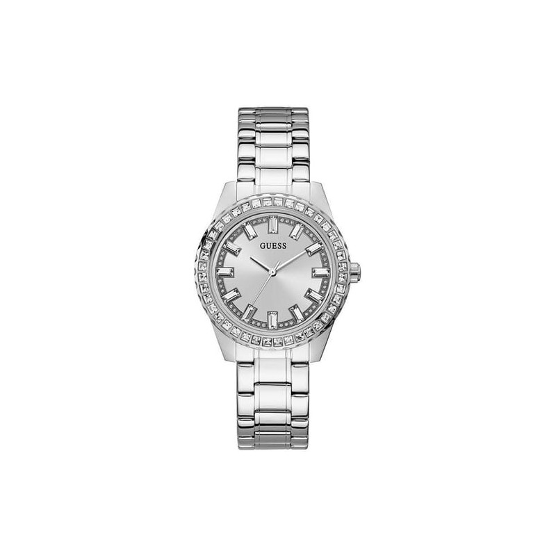 Guess Sparkler GW0111L1 women's analog fashion wristwatch from the Sparkler collection with quartz movement and time only function. 38mm diameter silver stainless steel case, white crystal embellished bezel, silver analog dial, baguette crystal indexes, mineral glass. Silver stainless steel bracelet with push button deployment clasp. 3 ATM water resistant: resistant to splashes of water but not under pressure.
