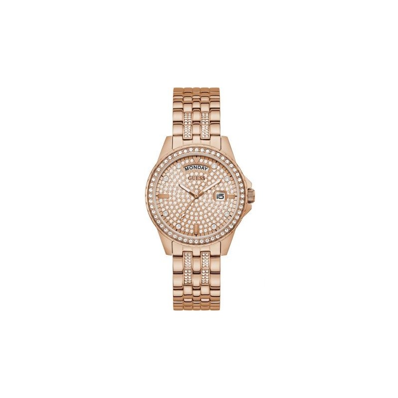 Guess women's wristwatch from the Comet collection with quartz movement. Rose gold-tone stainless steel case 38 mm in diameter and 10 mm thick, snap back, bezel set with white crystals, crystal pavé pink analogue dial with mixed stone and stick indexes and date function, mineral glass. Steel bracelet with rose gold IP treatment and white crystal inserts and with folding clasp with buttons. 3 ATM water resistant: resistant to splashes of water but not under pressure.