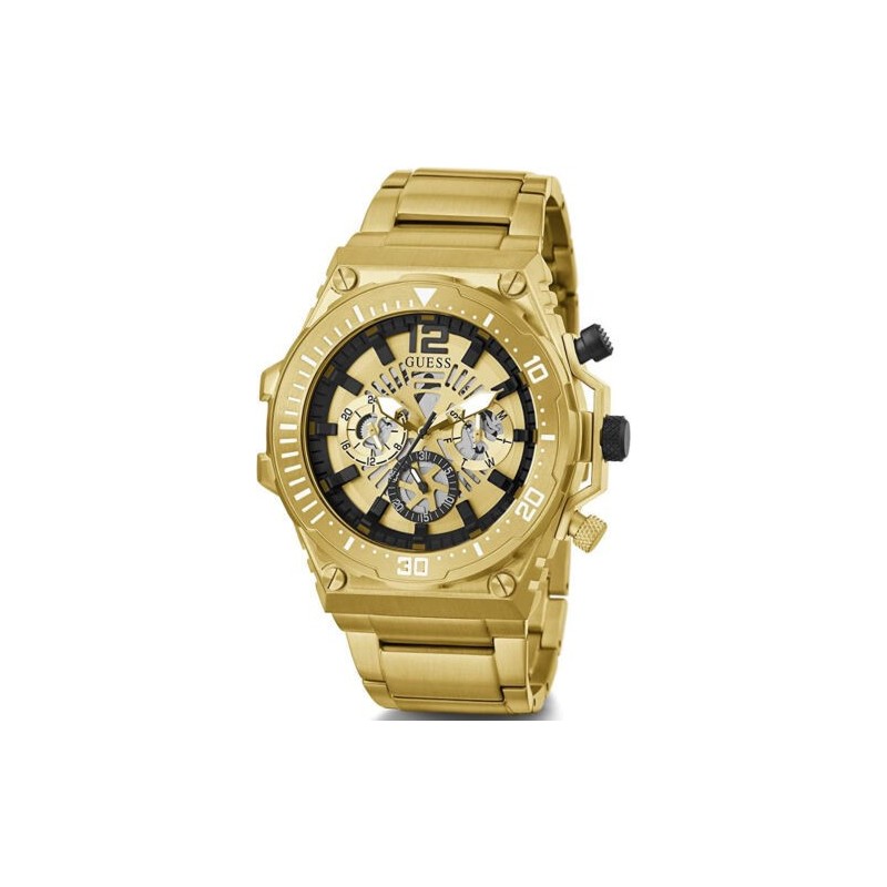 Guess men's wristwatch from the Exposure collection with a multifunction quartz movement and date display. Round, gold-tone stainless steel case with a satin finish and embellished with screws, 48 mm in diameter, gold-tone steel bezel with minute track. Gold-tone analog dial with black accents, stick indexes and an Arabic numeral at the 12 o'clock position only, subdials with date display, logo at the top, mineral crystal. Gold-tone stainless steel strap with a push-button deployment clasp, water resistance 5 ATM: splash-proof but not pressurized.