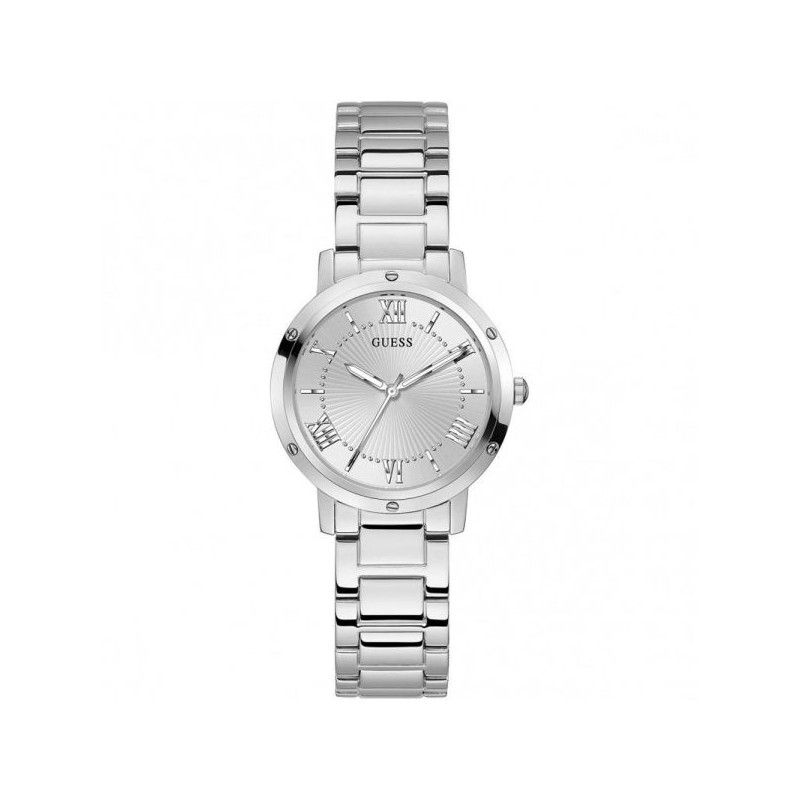 Guess women's wristwatch from the Dawn collection with quartz movement and time-only function. Round, silver-tone stainless steel case, 34 mm in diameter, polished silver-tone steel bezel with screws. Silver analog dial with Roman numeral indexes, logo on the top, mineral crystal. Silver-tone stainless steel strap with push-button deployment clasp, water resistance 3 ATM: splash-proof, but not pressurized.