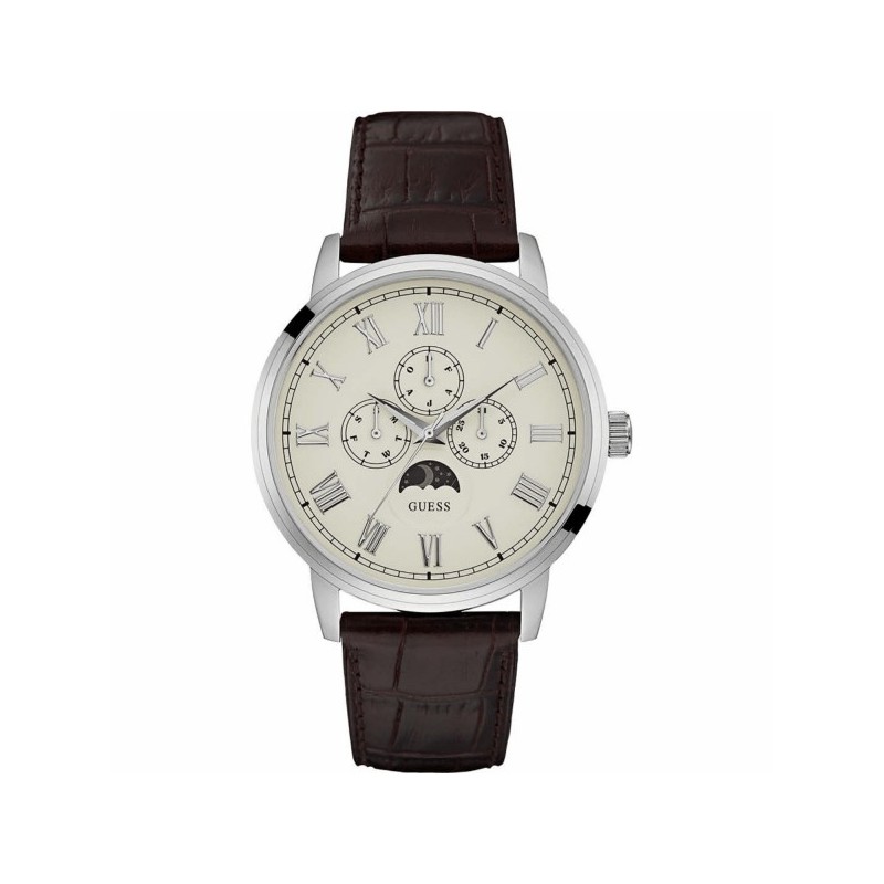 Guess men's wristwatch from the Delancy collection with quartz movement and time-only function with date. Round, silver-tone stainless steel case, 44 mm in diameter. Beige analog dial with Roman numeral indexes, subdials with date display, logo at the top, mineral crystal. Brown leather strap with pin buckle closure, water resistance 3 ATM: splash-proof but not pressurized.